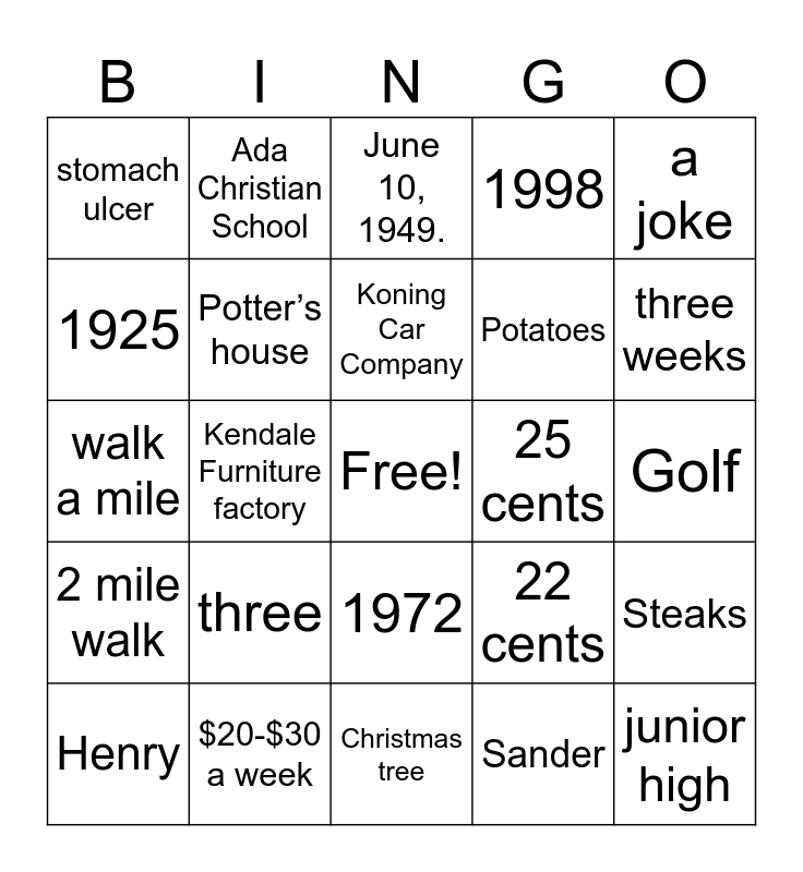 This bingo card has a free space and 63 words: Ryskamp Whole Sale meats, 1953, Sanitary Market, Steaks, Plumb’s Super Market, Ada Christian Reformed Church, Ada Christian School, late 1960’s, Koning Car Company, Beimers Car Sales, 1972, Cascade Cars, Golf, a joke, August 1, 1925, Kendale Furniture factory, stomach ulcer, 80, Potatoes, three, 2 mile walk, 1998, Calvin College, 1923, Nov. 13, 102, Gerrit, Bernie, Trena, Fannie, ship building, 2, 1929, three weeks, Henry, Minnie, Sander, Saturday, Potter’s house, walk a mile, 25 cents, Newspaper, fighting on the playground, junior high, $20-$30 a week, beef roast and potatoes, 22 cents, 12 cents, 1930, an ice cream cone, Christmas tree, 12 years old, clown, 17 years old, June 10, 1949., Edward Scholten, Arlene,MI, Mercy Hospital, pediatrics department, Metro Hospital, Porter Hills retirement Village and baby sweaters.