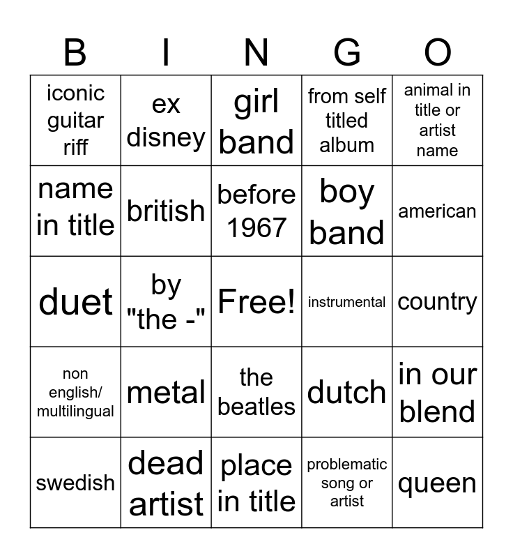 This bingo card has a free space and 24 words: metal, dead artist, before 1967, swedish, animal in title or artist name, iconic guitar riff, name in title, ex disney, instrumental, the beatles, boy band, duet, dutch, in our blend, british, problematic song or artist, country, girl band, american, by "the -", queen, non english/ multilingual, from self titled album and place in title.