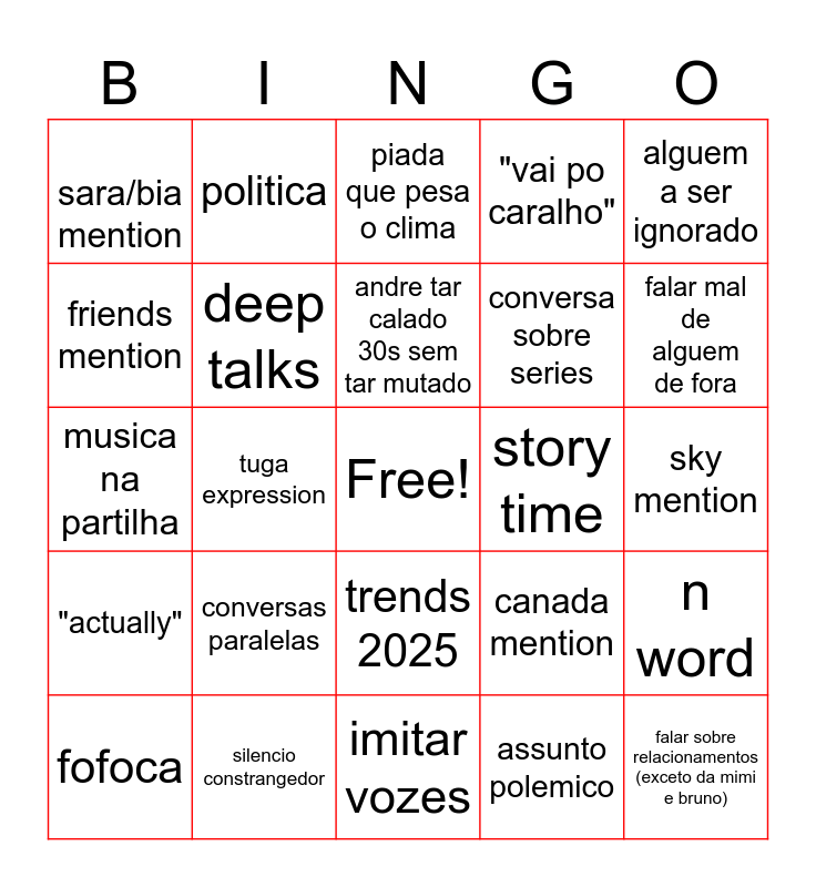 This bingo card has a free space and 24 words: conversas paralelas, silencio constrangedor, andre tar calado 30s sem tar mutado, fofoca, alguem a ser ignorado, sara/bia mention, friends mention, politica, story time, trends 2025, conversa sobre series, musica na partilha, canada mention, n word, deep talks, assunto polemico, sky mention, piada que pesa o clima, falar mal de alguem de fora, tuga expression, falar sobre relacionamentos (exceto da mimi e bruno), "actually", "vai po caralho" and imitar vozes.
