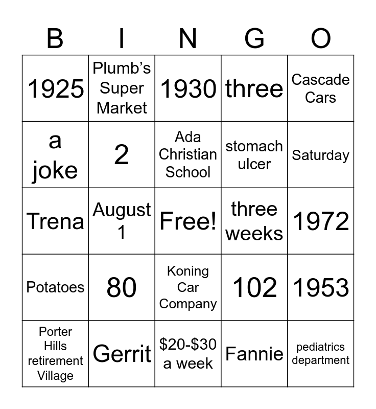 This bingo card has a free space and 65 words: Bonus 1, Bonus 2, Ryskamp Whole Sale meats, 1953, Sanitary Market, Steaks, Plumb’s Super Market, Ada Christian Reformed Church, Ada Christian School, late 1960’s, Koning Car Company, Beimers Car Sales, 1972, Cascade Cars, Golf, a joke, August 1, 1925, Kendale Furniture factory, stomach ulcer, 80, Potatoes, three, 2 mile walk, 1998, Calvin College, Arlene,MI, Mercy Hospital, pediatrics department, Metro Hospital, Porter Hills retirement Village, baby sweaters, 1923, Nov. 13, 102, Gerrit, Bernie, Trena, Fannie, ship building, 2, 1929, three weeks, Henry, Minnie, Sander, Saturday, Potter’s house, walk a mile, 25 cents, Newspaper, fighting on the playground, junior high, $20-$30 a week, beef roast and potatoes, 22 cents, 12 cents, 1930, an ice cream cone, Christmas tree, 12 years old, clown, 17 years old, June 10, 1949. and Edward Scholten.