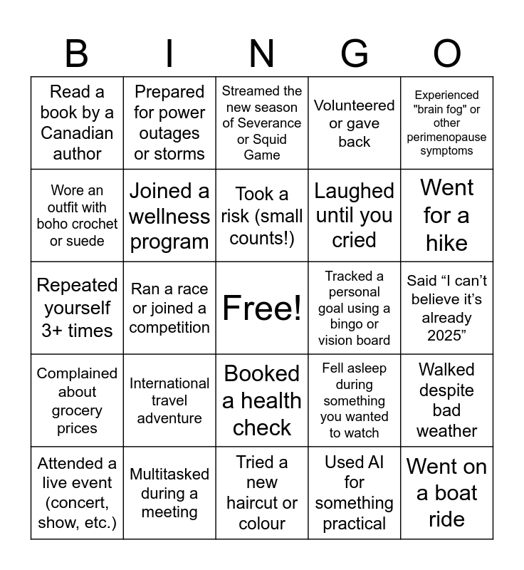 This bingo card has a free space and 29 words: Attended a live event (concert, show, etc.), Started a new hobby or creative project, Ran a race or joined a competition, Started taking vitamins seriously, Read a book by a Canadian author, Streamed the new season of Severance or Squid Game, Joined a wellness program, International travel adventure, Tracked a personal goal using a bingo or vision board, Multitasked during a meeting, Said “I can’t believe it’s already 2025”, Went on a boat ride, Tried a new haircut or colour, Used AI for something practical, Went for a hike, Domestic travel adventure, Booked a health check, Complained about grocery prices, Experienced "brain fog" or other perimenopause symptoms, Repeated yourself 3+ times, Fell asleep during something you wanted to watch, Bought new furniture, Laughed until you cried, Wore an outfit with boho crochet or suede, Volunteered or gave back, Prepared for power outages or storms, Walked despite bad weather, Took a risk (small counts!) and Felt more confident than your 30s.