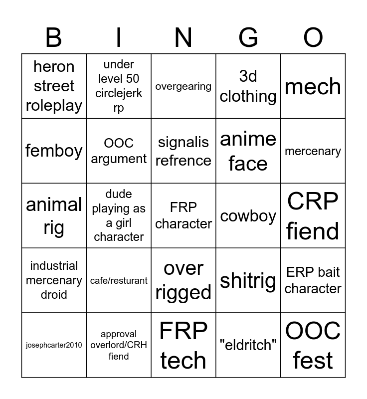 This bingo card has a free space and 24 words: cafe/resturant, approval overlord/CRH fiend, signalis refrence, josephcarter2010, mech, heron street roleplay, femboy, under level 50 circlejerk rp, cowboy, over rigged, anime face, animal rig, shitrig, ERP bait character, OOC argument, "eldritch", CRP fiend, overgearing, mercenary, dude playing as a girl character, OOC fest, industrial mercenary droid, 3d clothing and FRP tech.
