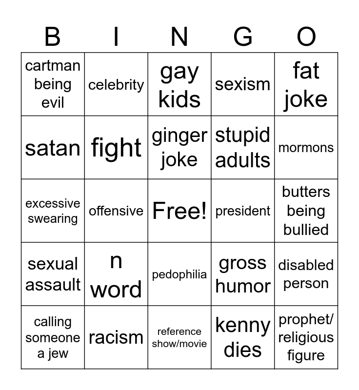 This bingo card has a free space and 24 words: n word, racism, ginger joke, calling someone a jew, fat joke, cartman being evil, satan, celebrity, president, pedophilia, stupid adults, excessive swearing, gross humor, disabled person, fight, kenny dies, butters being bullied, gay kids, mormons, offensive, prophet/ religious figure, sexual assault, sexism and reference show/movie.