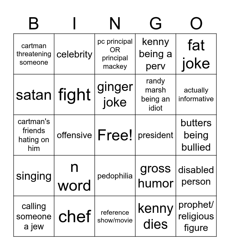 This bingo card has a free space and 24 words: n word, chef, ginger joke, calling someone a jew, fat joke, cartman threatening someone, satan, celebrity, president, pedophilia, randy marsh being an idiot, cartman's friends hating on him, gross humor, disabled person, fight, kenny dies, butters being bullied, pc principal OR principal mackey, actually informative, offensive, prophet/ religious figure, singing, kenny being a perv and reference show/movie.