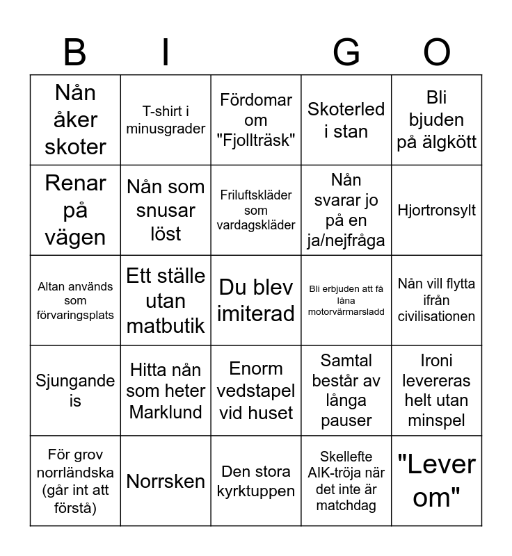 This bingo card has a free space and 24 words: Hitta nån som heter Marklund, Norrsken, Friluftskläder som vardagskläder, För grov norrländska (går int att förstå), Bli bjuden på älgkött, Nån åker skoter, Renar på vägen, T-shirt i minusgrader, Bli erbjuden att få låna motorvärmarsladd, Enorm vedstapel vid huset, Nån svarar jo på en ja/nejfråga, Altan används som förvaringsplats, Samtal består av långa pauser, Ironi levereras helt utan minspel, Nån som snusar löst, Skellefte AIK-tröja när det inte är matchdag, Nån vill flytta ifrån civilisationen, Fördomar om "Fjollträsk", Hjortronsylt, Ett ställe utan matbutik, "Lever om", Sjungande is, Skoterled i stan and Den stora kyrktuppen.