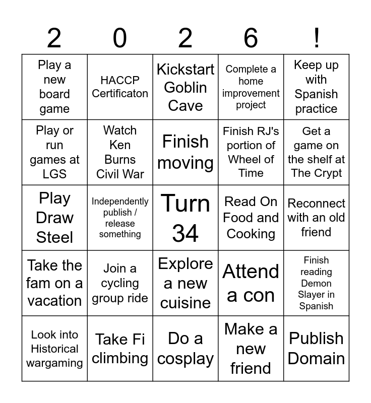 This bingo card has a free space and 24 words: Join a cycling group ride, Take Fi climbing, Finish moving, Look into Historical wargaming, Keep up with Spanish practice, Play a new board game, Play or run games at LGS, HACCP Certificaton, Read On Food and Cooking, Explore a new cuisine, Finish RJ's portion of Wheel of Time, Play Draw Steel, Attend a con, Finish reading Demon Slayer in Spanish, Watch Ken Burns Civil War, Make a new friend, Reconnect with an old friend, Kickstart Goblin Cave, Get a game on the shelf at The Crypt, Independently publish / release something, Publish Domain, Take the fam on a vacation, Complete a home improvement project and Do a cosplay.