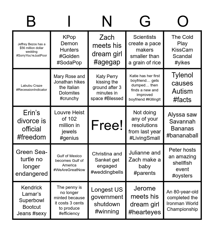 This bingo card has a free space and 24 words: Gulf of Mexico becomes Gulf of America #WeAreGreatNow, The penny is no longer minted because it costs 3 cents to produce #efficiency, Katy Perry kissing the ground after 3 minutes in space #Blessed, Kendrick Lamar’s Superbowl Bootcut Jeans #sexy, The Cold Play KissCam Scandal #yikes, Jeffrey Bezos has a $56 million dollar wedding #SorryYou’reJustPoor, Labubu Craze #RecessionIndicator, KPop Demon Hunters #Golden #SodaPop, Not doing any of your resolutions from last year #LivingSmall, Christina and Sanket get engaged #weddingbells, Katie has her first boyfriend… gets dumped… then finds a new and improved boyfriend #KillingIt, Erin’s divorce is official #freedom, Julianne and Zach make a baby #parents, Peter hosts an amazing shellfish event #oysters, Mary Rose and Jonathan hikes the Italian Dolomites #crunchy, Jerome meets his dream girl #hearteyes, Alyssa saw Savannah Bananas #bananaball, Zach meets his dream girl #agegap, Tylenol causes Autism #facts, Louvre Heist of 102 million in jewels #genius, An 80-year-old completed the Ironman World Championship, Green Sea- turtle no longer endangered, Scientists create a pace makers smaller than a grain of rice and Longest US government shutdown #winning.