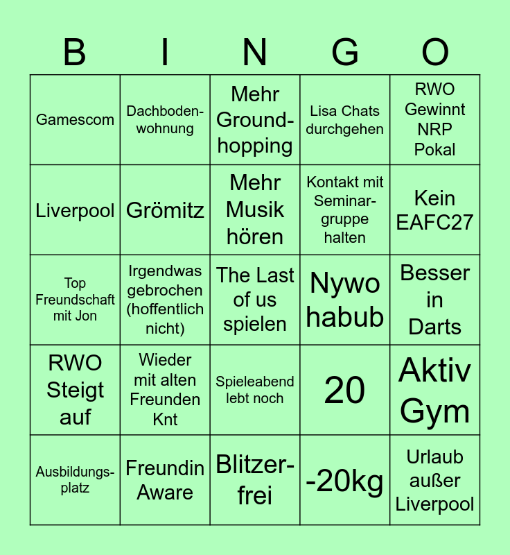 This bingo card has 25 words: Wieder mit alten Freunden Knt, Blitzer-frei, Mehr Musik hören, Ausbildungs-platz, RWO Gewinnt NRP Pokal, Gamescom, Liverpool, Dachboden-wohnung, Nywo habub, Spieleabend lebt noch, Kontakt mit Seminar-gruppe halten, Top Freundschaft mit Jon, 20, Aktiv Gym, Grömitz, Urlaub außer Liverpool, Besser in Darts, Mehr Ground-hopping, Kein EAFC27, Irgendwas gebrochen (hoffentlich nicht), The Last of us spielen, Freundin Aware, RWO Steigt auf, Lisa Chats durchgehen and -20kg.