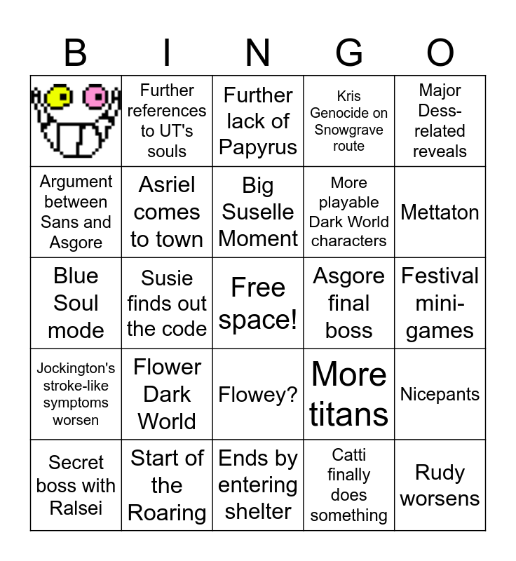 This bingo card has 1 images, a free space and 23 words: Flower Dark World, Start of the Roaring, Big Suselle Moment, Secret boss with Ralsei, Major Dess-related reveals, Argument between Sans and Asgore, Further references to UT's souls, Asgore final boss, Flowey?, More playable Dark World characters, Blue Soul mode, More titans, Nicepants, Asriel comes to town, Catti finally does something, Festival mini-games, Further lack of Papyrus, Mettaton, Susie finds out the code, Rudy worsens, Jockington's stroke-like symptoms worsen, Kris Genocide on Snowgrave route and Ends by entering shelter.