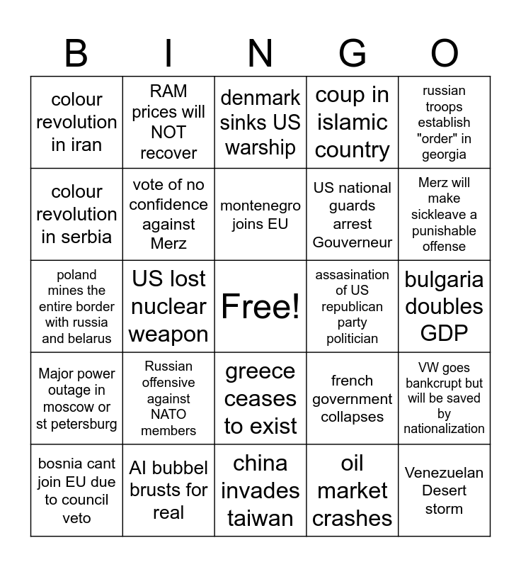 This bingo card has a free space and 24 words: Russian offensive against NATO members, AI bubbel brusts for real, montenegro joins EU, bosnia cant join EU due to council veto, russian troops establish "order" in georgia, colour revolution in iran, colour revolution in serbia, RAM prices will NOT recover, assasination of US republican party politician, greece ceases to exist, US national guards arrest Gouverneur, poland mines the entire border with russia and belarus, french government collapses, VW goes bankcrupt but will be saved by nationalization, vote of no confidence against Merz, oil market crashes, bulgaria doubles GDP, denmark sinks US warship, Merz will make sickleave a punishable offense, US lost nuclear weapon, Venezuelan Desert storm, Major power outage in moscow or st petersburg, coup in islamic country and china invades taiwan.