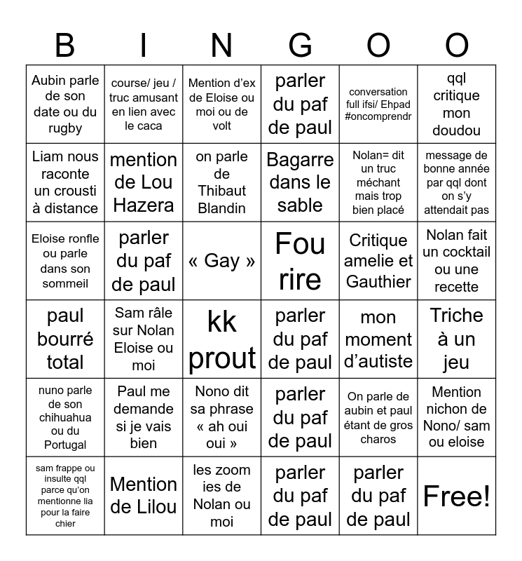 This bingo card has 42 words: parler du paf de paul, mention de Lou Hazera, vomito, Critique amelie et Gauthier, Triche à un jeu, Sam râle sur Nolan Eloise ou moi, Eloise ronfle ou parle dans son sommeil, on parle de musique avec paul, Mention d’ex de Eloise ou moi ou de volt, Nolan fait un cocktail ou une recette, « Gay », Bagarre dans le sable, message de bonne année par qql dont on s’y attendait pas, conversation full ifsi/ Ehpad #oncomprendr, Mention de Lilou, paul bourré total, Mention nichon de Nono/ sam ou eloise, Nolan= dit un truc méchant mais trop bien placé, Free!, course/ jeu / truc amusant en lien avec le caca, qql critique mon doudou, Nono dit sa phrase « ah oui oui », nuno parle de son chihuahua ou du Portugal, Aubin parle de son date ou du rugby, on renversé un truc, sam frappe ou insulte qql parce qu’on mentionne lia pour la faire chier, on parle de Thibaut Blandin, On parle de rim et Thibault, Paul me demande si je vais bien, On parle de aubin et paul étant de gros charos, Eloise chiale, Fou rire, Liam nous raconte un crousti à distance, mon moment d’autiste, les zoom ies de Nolan ou moi, kk prout, parler du paf de paul, parler du paf de paul, parler du paf de paul, parler du paf de paul, parler du paf de paul and parler du paf de paul.