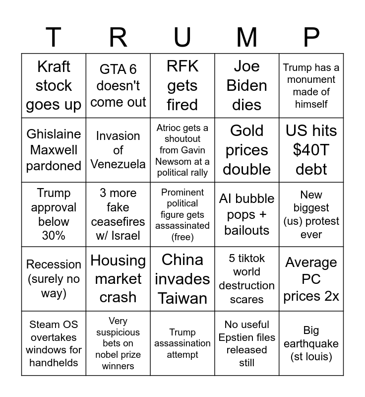 This bingo card has a free space and 24 words: Housing market crash, Very suspicious bets on nobel prize winners, Atrioc gets a shoutout from Gavin Newsom at a political rally, Steam OS overtakes windows for handhelds, Trump has a monument made of himself, Kraft stock goes up, Ghislaine Maxwell pardoned, GTA 6 doesn't come out, AI bubble pops + bailouts, China invades Taiwan, Gold prices double, Trump approval below 30%, 5 tiktok world destruction scares, Average PC prices 2x, Invasion of Venezuela, No useful Epstien files released still, New biggest (us) protest ever, RFK gets fired, US hits $40T debt, 3 more fake ceasefires w/ Israel, Big earthquake (st louis), Recession (surely no way), Joe Biden dies and Trump assassination attempt.