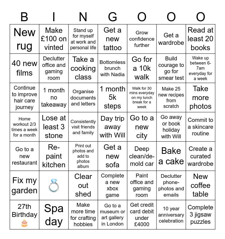 This bingo card has 49 words: Declutter phone- photos and emails, Build courage to go for smear test, Get credit card debit under £4000, Lose at least 3 stone, Organise documents and letters, Commit to a skincare routine, Make £100 on vinted, Make more time for crafting hobbies, Get a wardrobe, Get a new sofa, Read at least 20 books, Get a new tattoo, Make 25 new recipes from scratch, Walk for 30 mins everyday on my lunch break for a week, 💍, Go away or book holiday with Will, 40 new films, Wake up between 6-7am everyday for a week, New coffee table, Grow confidence further, Go for a 10k walk, Consistently visit friends and family, New rug, Declutter office and gaming room, 27th Birthday 🎂, Take a cooking class, Take more photos, Spa day, 1 month 5k steps, 1 month no takeaway, Complete 3 jigsaw puzzles, Go to a new city, Fix my garden, Clear out shed, Home workout 2/3 times a week for a month, Deep clean/de-mold car, Bake a cake, Create a curated wardrobe, Continue to improve hair care journey, Print out photos and add to photos album, Complete a new xbox game, Go to a new restaurant, Day trip away with Will, Go to a museum or art gallery in London, Bottomless brunch with Nadia, Stand up for myself at work and personal life, Paint office and gaming room, Re-paint kitchen and 10 year anniversary celebration.