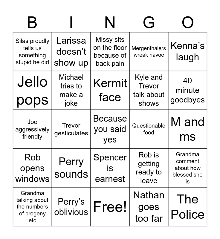 This bingo card has 26 words: Rob opens windows, Perry’s oblivious, Kermit face, Nathan goes too far, Kenna’s laugh, Silas proudly tells us something stupid he did, Michael tries to make a joke, Missy sits on the floor because of back pain, Kyle and Trevor talk about shows, The Police, Jello pops, Trevor gesticulates, Free!, Rob is getting ready to leave, M and ms, Grandma expresses gratitude for her sweetheart, Larissa doesn’t show up, Spencer is earnest, Mergenthalers wreak havoc, Grandma comment about how blessed she is, Joe aggressively friendly, Perry sounds, Because you said yes, Questionable food, 40 minute goodbyes and Grandma talking about the numbers of progeny etc.
