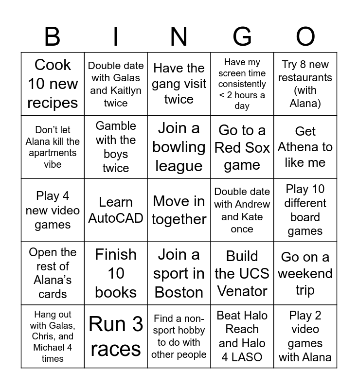 This bingo card has a free space and 24 words: Finish 10 books, Run 3 races, Join a bowling league, Hang out with Galas, Chris, and Michael 4 times, Try 8 new restaurants (with Alana), Cook 10 new recipes, Don’t let Alana kill the apartments vibe, Double date with Galas and Kaitlyn twice, Double date with Andrew and Kate once, Join a sport in Boston, Go to a Red Sox game, Play 4 new video games, Build the UCS Venator, Go on a weekend trip, Gamble with the boys twice, Beat Halo Reach and Halo 4 LASO, Play 10 different board games, Have the gang visit twice, Get Athena to like me, Learn AutoCAD, Play 2 video games with Alana, Open the rest of Alana’s cards, Have my screen time consistently < 2 hours a day and Find a non-sport hobby to do with other people.