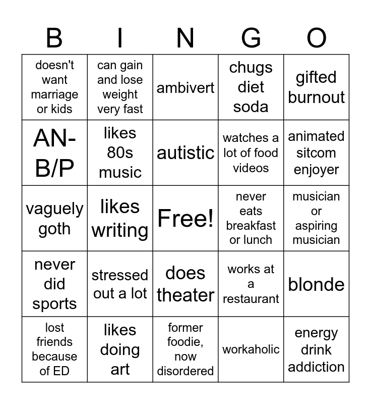 This bingo card has a free space and 24 words: stressed out a lot, likes doing art, autistic, lost friends because of ED, gifted burnout, doesn't want marriage or kids, AN-B/P, can gain and lose weight very fast, never eats breakfast or lunch, does theater, watches a lot of food videos, vaguely goth, works at a restaurant, blonde, likes 80s music, workaholic, musician or aspiring musician, ambivert, animated sitcom enjoyer, likes writing, energy drink addiction, never did sports, chugs diet soda and former foodie, now disordered.
