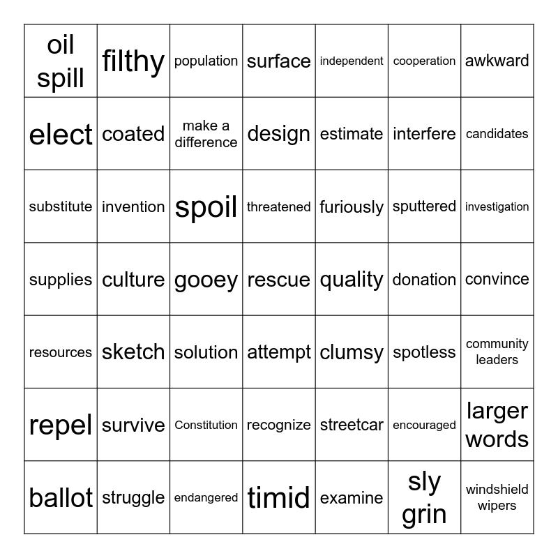 This bingo card has 50 words: larger words, interfere, sly grin, culture, spoil, attempt, filthy, timid, cooperation, clumsy, awkward, surface, sputtered, furiously, Constitution, convince, elect, candidates, ballot, independent, estimate, gooey, oil spill, coated, struggle, rescue, make a difference, endangered, population, threatened, habitat, resources, survive, recognize, supplies, donation, spotless, community leaders, repel, substitute, solution, streetcar, sketch, examine, investigation, design, quality, encouraged, invention and windshield wipers.