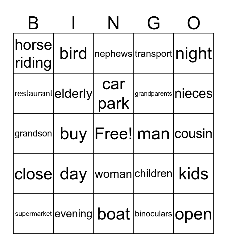 This bingo card has a free space and 24 words: day, evening, car park, supermarket, night, horse riding, restaurant, bird, man, woman, grandparents, grandson, children, kids, elderly, binoculars, cousin, nephews, nieces, buy, open, close, transport and boat.