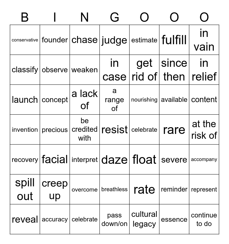 This bingo card has 64 words: indicate, at the risk of, starvation, available, interpret, reveal, founder, be fueled by, classify, accuracy, a range of, rate, launch, estimate, be convinced of, fulfill, get rid of, conservative, comment on, observe, a lack of, concept, judge, facial, slightly, severe, daze, swell, rare, spill out, assign, breathless, pull over, worsen, weaken, content, reminder, be credited with, accompany, in vain, in case, in relief, represent, fall on, celebrate, since then, invention, resist, nourishing, pass down/on, essence, continue to do, precious, recovery, complex, overcome, chase, footprint, float, creep up, cultural legacy, long for, celebrate and frozen.