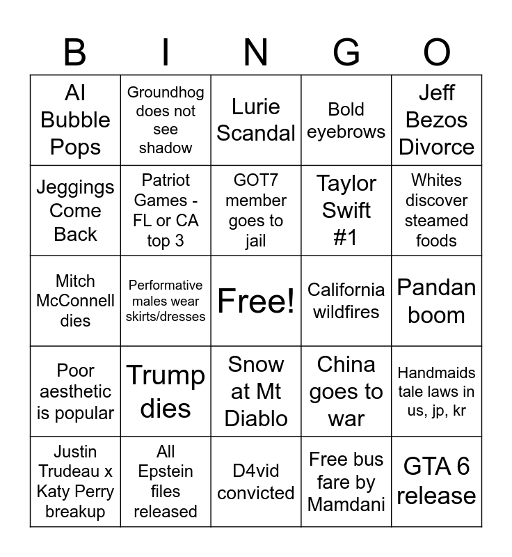 This bingo card has a free space and 24 words: Trump dies, All Epstein files released, GOT7 member goes to jail, Justin Trudeau x Katy Perry breakup, Jeff Bezos Divorce, AI Bubble Pops, Jeggings Come Back, Groundhog does not see shadow, California wildfires, Snow at Mt Diablo, Taylor Swift #1, Mitch McConnell dies, China goes to war, Handmaids tale laws in us, jp, kr, Patriot Games - FL or CA top 3, Free bus fare by Mamdani, Pandan boom, Lurie Scandal, Whites discover steamed foods, Performative males wear skirts/dresses, GTA 6 release, Poor aesthetic is popular, Bold eyebrows and D4vid convicted.