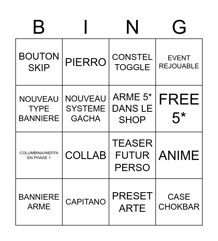 This bingo card has 16 words: CAPITANO, ANIME, CONSTEL TOGGLE, BOUTON SKIP, COLUMBINA/INEFFA EN PHASE 1, PIERRO, TEASER FUTUR PERSO, PRESET ARTE, NOUVEAU TYPE BANNIERE, NOUVEAU SYSTEME GACHA, BANNIERE ARME, EVENT REJOUABLE, COLLAB, FREE 5*, ARME 5* DANS LE SHOP and CASE CHOKBAR.