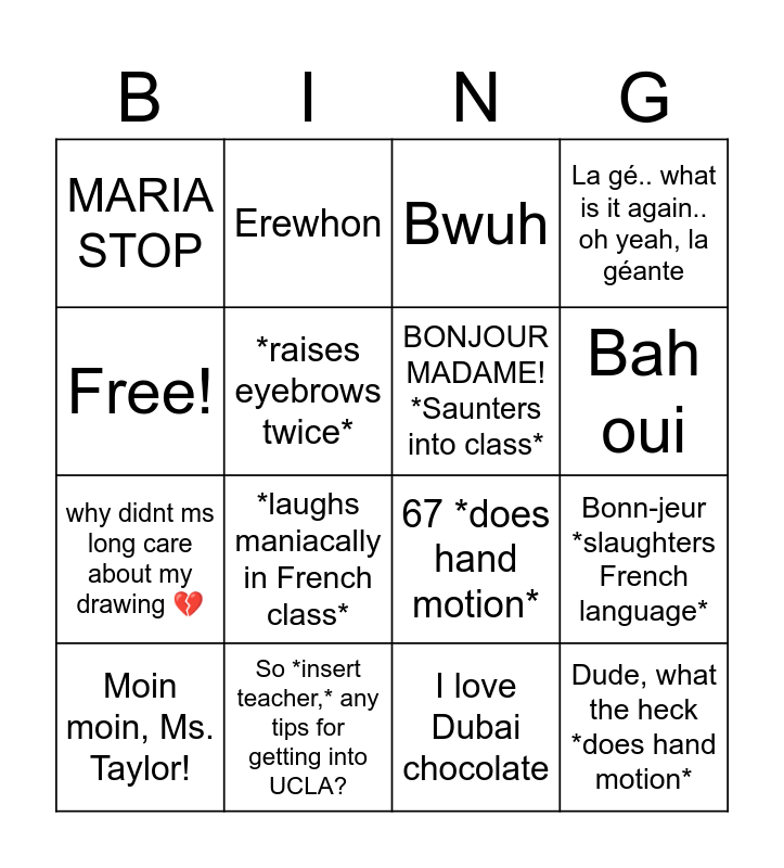 This bingo card has 16 words: So *insert teacher,* any tips for getting into UCLA?, Bonn-jeur *slaughters French language*, Bwuh, MARIA STOP, why didnt ms long care about my drawing 💔, Erewhon, 67 *does hand motion*, I love Dubai chocolate, Free!, *raises eyebrows twice*, Moin moin, Ms. Taylor!, La gé.. what is it again.. oh yeah, la géante, *laughs maniacally in French class*, Bah oui, BONJOUR MADAME! *Saunters into class* and Dude, what the heck *does hand motion*.