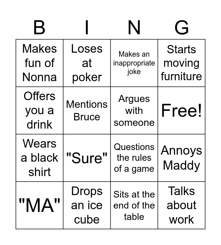 This bingo card has 18 words: "Sure", Talks about work, Makes an inappropriate joke, Makes fun of Nonna, Questions the rules of a game, Starts moving furniture, "MA", Loses at poker, Free!, Wears a black shirt, Sits at the end of the table, Offers you a drink, Annoys Maddy, Mentions Bruce, Argues with someone, Tells story about US experience, Drops an ice cube and Talks about soccer.