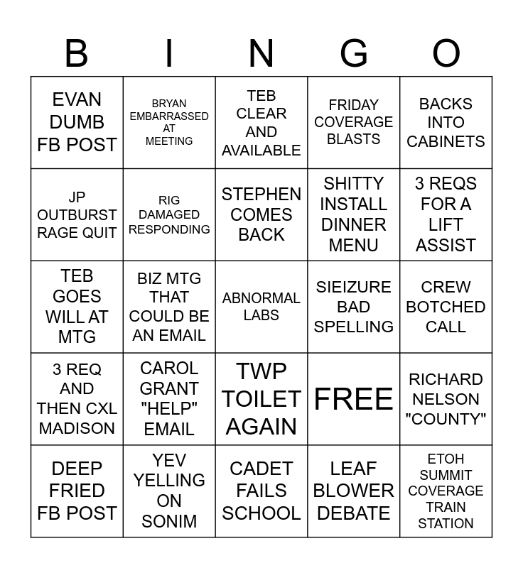 This bingo card has 25 words: CAROL GRANT "HELP" EMAIL, CADET FAILS SCHOOL, STEPHEN COMES BACK, DEEP FRIED FB POST, BACKS INTO CABINETS, EVAN DUMB FB POST, JP OUTBURST RAGE QUIT, BRYAN EMBARRASSED AT MEETING, SIEIZURE BAD SPELLING, TWP TOILET AGAIN, SHITTY INSTALL DINNER MENU, TEB GOES WILL AT MTG, FREE, RICHARD NELSON "COUNTY", RIG DAMAGED RESPONDING, ETOH SUMMIT COVERAGE TRAIN STATION, CREW BOTCHED CALL, TEB CLEAR AND AVAILABLE, 3 REQS FOR A LIFT ASSIST, BIZ MTG THAT COULD BE AN EMAIL, ABNORMAL LABS, YEV YELLING ON SONIM, 3 REQ AND THEN CXL MADISON, FRIDAY COVERAGE BLASTS and LEAF BLOWER DEBATE.