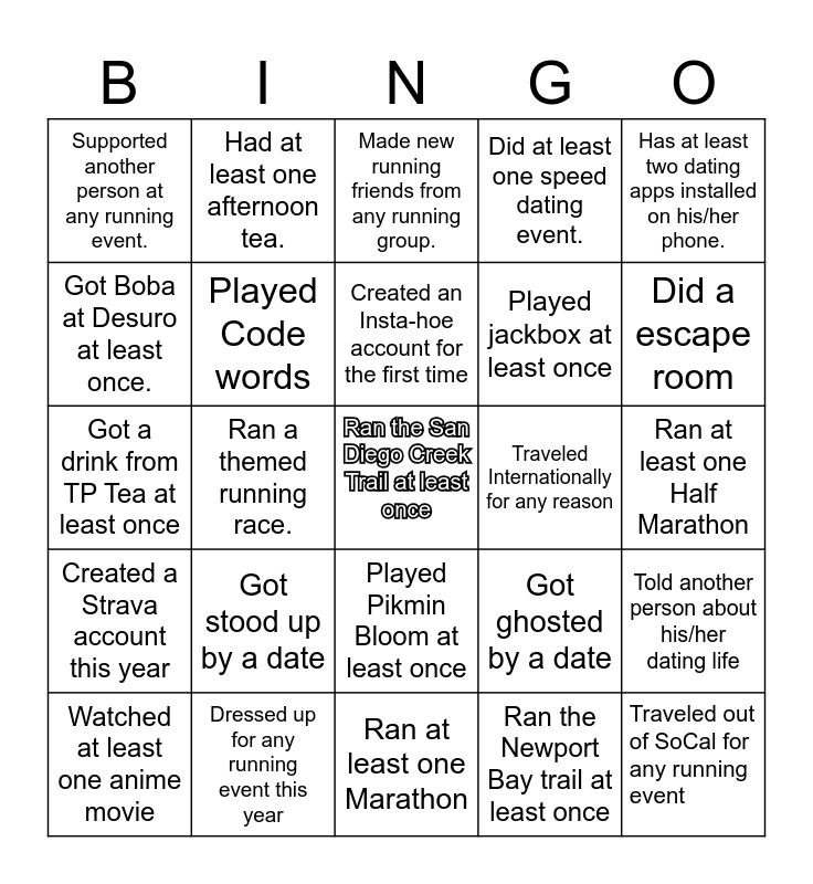 This bingo card has 25 words: Got stood up by a date, Ran at least one Marathon, Created an Insta-hoe account for the first time, Watched at least one anime movie, Has at least two dating apps installed on his/her phone., Supported another person at any running event., Got Boba at Desuro at least once., Had at least one afternoon tea., Traveled Internationally for any reason, Played Pikmin Bloom at least once, Played jackbox at least once, Got a drink from TP Tea at least once, Got ghosted by a date, Told another person about his/her dating life, Played Code words, Traveled out of SoCal for any running event, Ran at least one Half Marathon, Made new running friends from any running group., Did a escape room, Ran a themed running race., Ran the San Diego Creek Trail at least once, Dressed up for any running event this year, Created a Strava account this year, Did at least one speed dating event. and Ran the Newport Bay trail at least once.