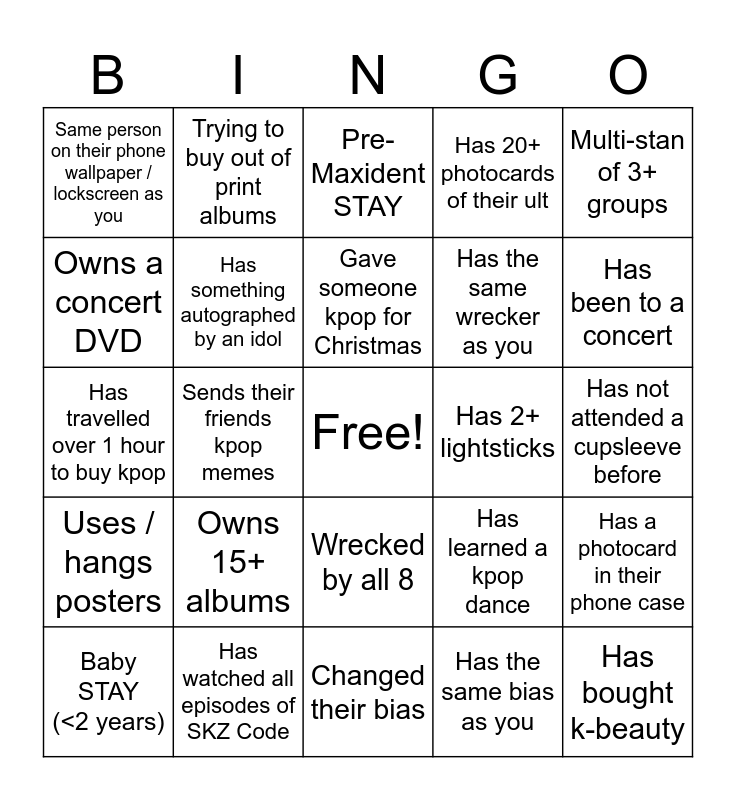 This bingo card has a free space and 31 words: Changed their bias, Got up early to watch a concert online, Sends their friends kpop memes, Has watched an MV within 10 minutes of it dropping, Same person on their phone wallpaper / lockscreen as you, Pre-Maxident STAY, Has something autographed by an idol, Has learned a kpop dance, Has 2+ lightsticks, Has the same bias as you, Has not attended a cupsleeve before, Has bought k-beauty, Has traded a photocard, Made a new friend because of kpop, Has been to a concert, Owns 5+ albums, Has a photocard in their phone case, Owns 15+ albums, Uses / hangs posters, Wrecked by all 8, Multi-stan of 3+ groups, Stray Kids has made them cry, Baby STAY (<2 years), Trying to buy out of print albums, Has the same wrecker as you, Owns a concert DVD, Has 20+ photocards of their ult, Has travelled over 1 hour to buy kpop, Has watched all episodes of SKZ Code, Gave someone kpop for Christmas and Has NOT watched Kpop Demon Hunters.