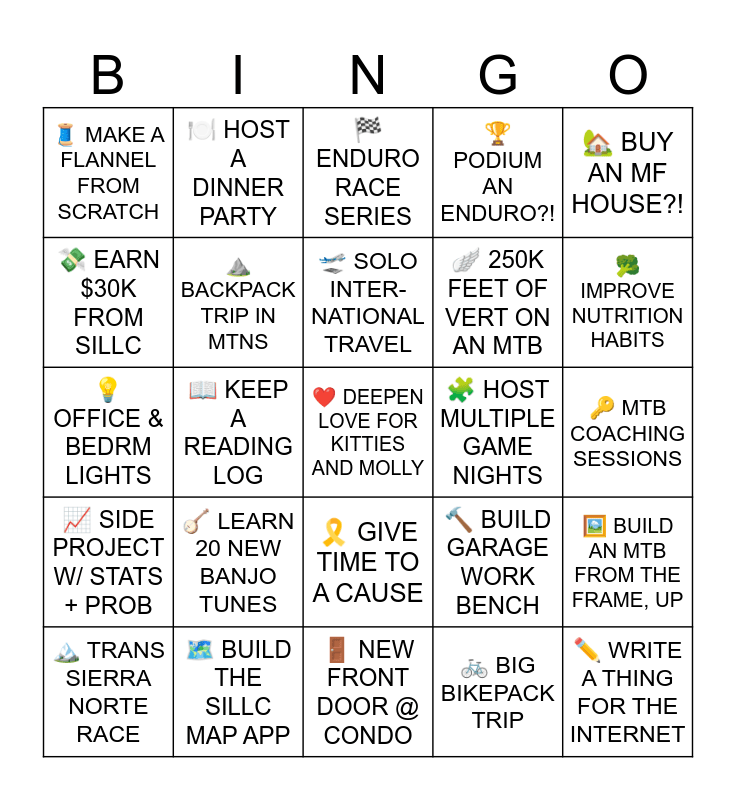 This bingo card has a free space and 24 words: πͺ LEARN 20 NEW BANJO TUNES, πΊοΈ BUILD THE SILLC MAP APP, π« SOLO INTER- NATIONAL TRAVEL, ποΈ TRANS SIERRA NORTE RACE, π‘ BUY AN MF HOUSE?!, π§΅ MAKE A FLANNEL FROM SCRATCH, πΈ EARN $30K FROM SILLC, π½οΈ HOST A DINNER PARTY, π§© HOST MULTIPLE GAME NIGHTS, ποΈ GIVE TIME TO A CAUSE, πͺ½ 250K FEET OF VERT ON AN MTB, π‘ OFFICE & BEDRM LIGHTS, π¨ BUILD GARAGE WORK BENCH, πΌοΈ BUILD AN MTB FROM THE FRAME, UP, β°οΈ BACKPACK TRIP IN MTNS, π² BIG BIKEPACK TRIP, π MTB COACHING SESSIONS, π ENDURO RACE SERIES, π₯¦ IMPROVE NUTRITION HABITS, π KEEP A READING LOG, βοΈ WRITE A THING FOR THE INTERNET, π SIDE PROJECT W/ STATS + PROB, π PODIUM AN ENDURO?! and πͺ NEW FRONT DOOR @ CONDO.
