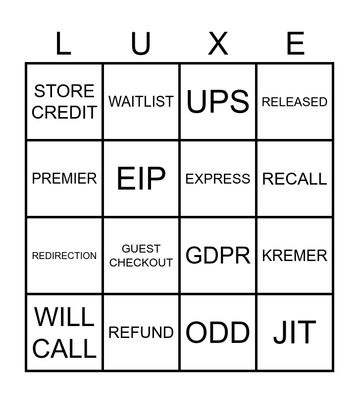 This bingo card has 16 words: WILL CALL, REFUND, UPS, RELEASED, PREMIER, WAITLIST, GDPR, KREMER, STORE CREDIT, EIP, ODD, RECALL, REDIRECTION, GUEST CHECKOUT, EXPRESS and JIT.