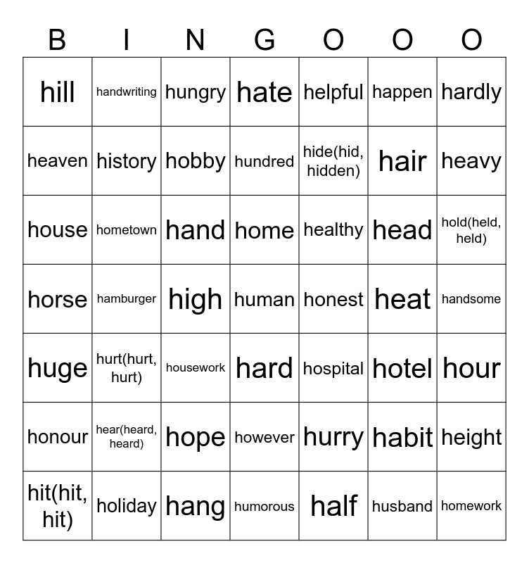 This bingo card has 49 words: habit, hair, half, hamburger, hand, handsome, handwriting, hang, happen, hard, hardly, hate, head, healthy, hear(heard, heard), heat, heaven, heavy, height, helpful, hide(hid, hidden), high, hill, history, hit(hit, hit), hobby, hold(held, held), holiday, home, hometown, homework, honest, honour, hope, horse, hospital, hotel, hour, house, housework, however, huge, human, humorous, hundred, hungry, hurry, hurt(hurt, hurt) and husband.