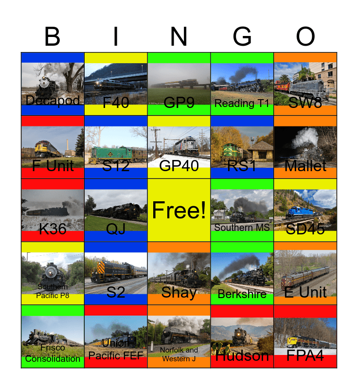 This bingo card has 24 images, a free space and 24 words: S2, Union Pacific FEF, GP40, Frisco Consolidation, SW8, Decapod, F Unit, F40, Southern MS, Shay, RS1, K36, Berkshire, E Unit, S12, Hudson, SD45, GP9, Mallet, QJ, FPA4, Southern Pacific P8, Reading T1 and Norfolk and Western J.