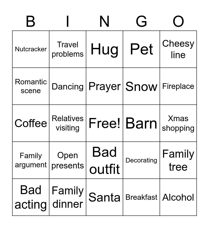 This bingo card has a free space and 24 words: Bad acting, Open presents, Prayer, Breakfast, Cheesy line, Nutcracker, Travel problems, Hug, Barn, Xmas shopping, Coffee, Dancing, Decorating, Family tree, Romantic scene, Family dinner, Santa, Pet, Fireplace, Family argument, Relatives visiting, Bad outfit, Snow and Alcohol.