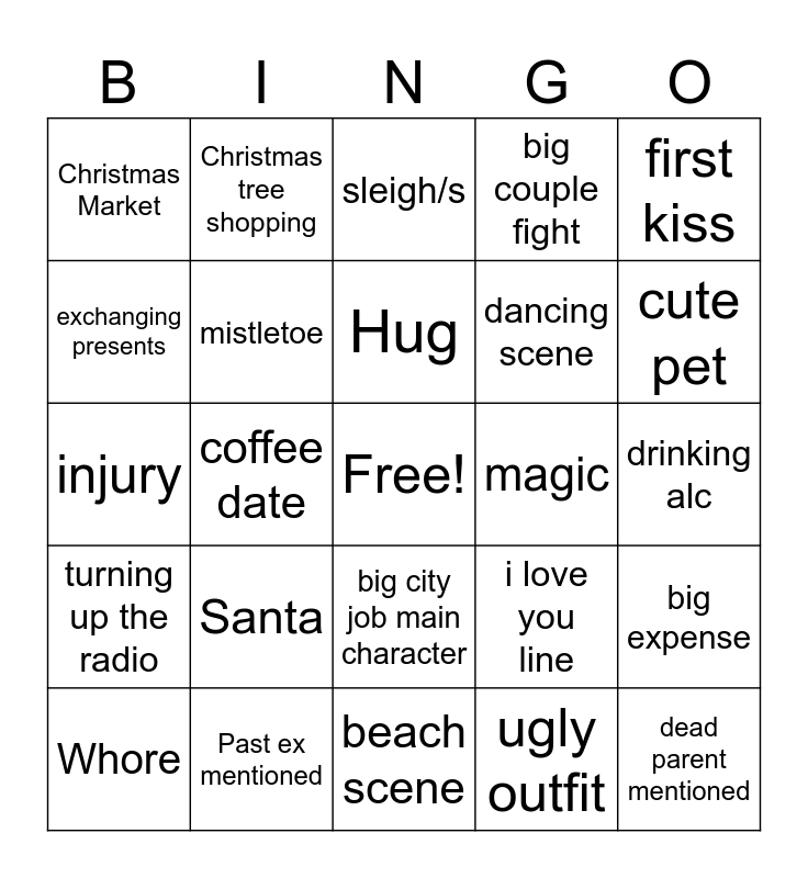 This bingo card has a free space and 24 words: Santa, Past ex mentioned, Hug, Whore, first kiss, Christmas Market, exchanging presents, Christmas tree shopping, magic, big city job main character, dancing scene, injury, i love you line, big expense, mistletoe, ugly outfit, drinking alc, sleigh/s, cute pet, coffee date, dead parent mentioned, turning up the radio, big couple fight and beach scene.