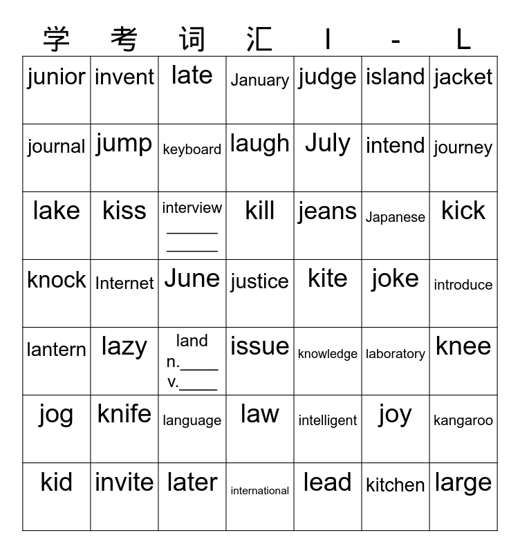 This bingo card has a free space and 48 words: intelligent, intend, international, Internet, interview ______ ______, introduce, invent, invite, island, issue, jacket, January, Japanese, jeans, jog, joke, journal, journey, joy, judge, July, June, junior, jump, kangaroo, keyboard, kick, kid, kill, kiss, kitchen, kite, knee, knife, knock, knowledge, laboratory, lake, land n.____ v.____, language, lantern, large, late, later, laugh, law, lazy and lead.