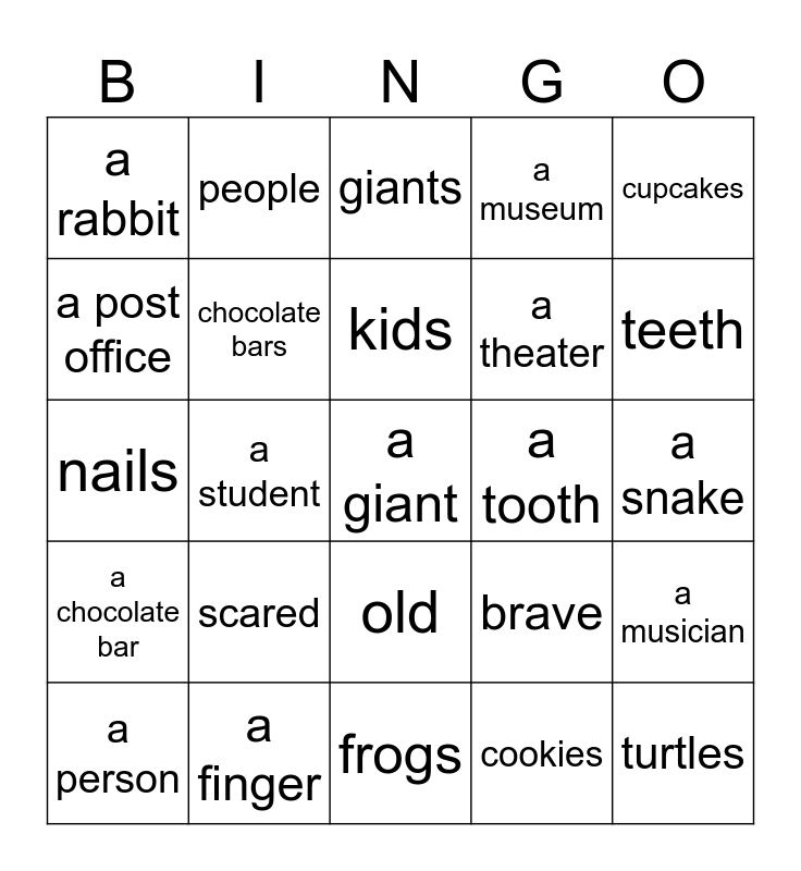 This bingo card has a free space and 34 words: a cookie, cookies, a lollipop, lollipops, a chocolate bar, chocolate bars, cupcakes, a person, people, a kid, kids, giants, an angel, angels, a tooth, teeth, a finger, nails, scared, brave, old, young, a rabbit, a snake, frogs, turtles, a museum, a hospital, a theater, a post office, a teacher, a student, a musician and a piano.
