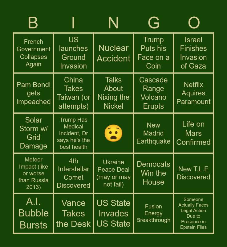 This bingo card has a free space and 24 words: 4th Interstellar Comet Discovered, Vance Takes the Desk, Talks About Nixing the Nickel, A.I. Bubble Bursts, Israel Finishes Invasion of Gaza, French Government Collapses Again, Pam Bondi gets Impeached, US launches Ground Invasion, New Madrid Earthquake, Ukraine Peace Deal (may or may not fail), Cascade Range Volcano Erupts, Solar Storm w/ Grid Damage, Democats Win the House, New T.L.E Discovered, China Takes Taiwan (or attempts), Fusion Energy Breakthrough, Life on Mars Confirmed, Nuclear Accident, Netflix Aquires Paramount, Trump Has Medical Incident, Dr says he's the best health, Someone Actually Faces Legal Action Due to Presence in Epstein Files, Meteor Impact (like or worse than Russia 2013), Trump Puts his Face on a Coin and US State Invades US State.