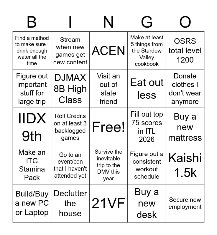 This bingo card has a free space and 24 words: Go to an event/con that I haven't attended yet, Declutter the house, Visit an out of state friend, Build/Buy a new PC or Laptop, OSRS total level 1200, Find a method to make sure I drink enough water all the time, Figure out important stuff for large trip, Stream when new games get new content, Fill out top 75 scores in ITL 2026, Survive the inevitable trip to the DMV this year, Eat out less, IIDX 9th, Figure out a consistent workout schedule, Kaishi 1.5k, DJMAX 8B High Class, Buy a new desk, Buy a new mattress, ACEN, Donate clothes I don't wear anymore, Roll Credits on at least 3 backlogged games, Secure new employment, Make an ITG Stamina Pack, Make at least 5 things from the Stardew Valley cookbook and 21VF.