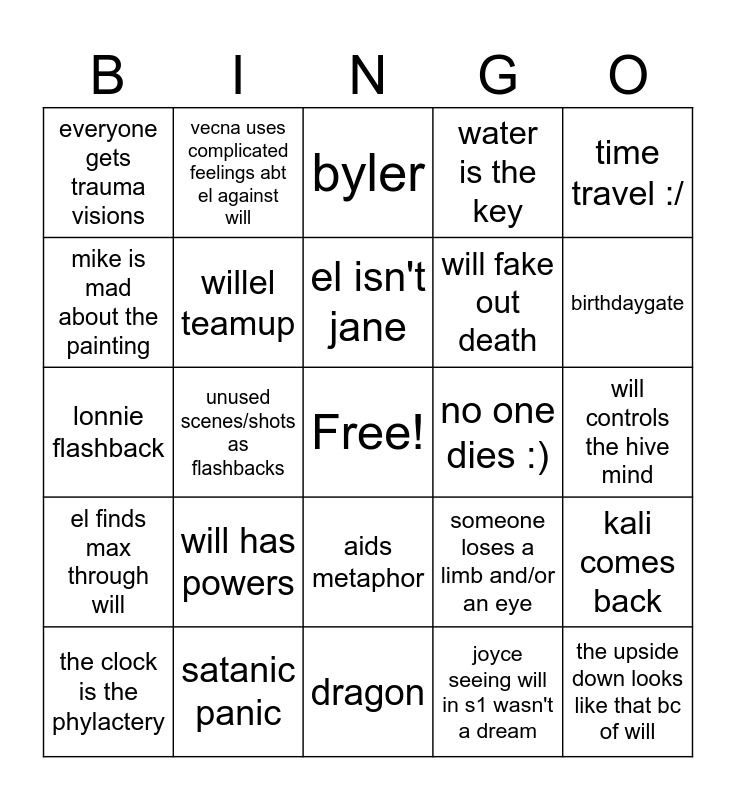 This bingo card has a free space and 24 words: will has powers, satanic panic, el isn't jane, the clock is the phylactery, time travel :/, everyone gets trauma visions, mike is mad about the painting, vecna uses complicated feelings abt el against will, no one dies :), aids metaphor, will fake out death, lonnie flashback, someone loses a limb and/or an eye, kali comes back, willel teamup, joyce seeing will in s1 wasn't a dream, will controls the hive mind, byler, birthdaygate, unused scenes/shots as flashbacks, the upside down looks like that bc of will, el finds max through will, water is the key and dragon.
