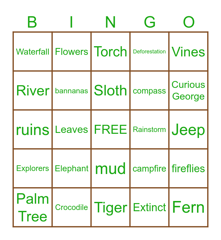 This bingo card has a free space and 25 words: Elephant, Tiger, Sloth, Palm Tree, Vines, Waterfall, River, Flowers, Rainstorm, mud, compass, ruins, campfire, fireflies, bannanas, snake, Jeep, Torch, Curious George, Leaves, Fern, Crocodile, Explorers, Deforestation and Extinct.