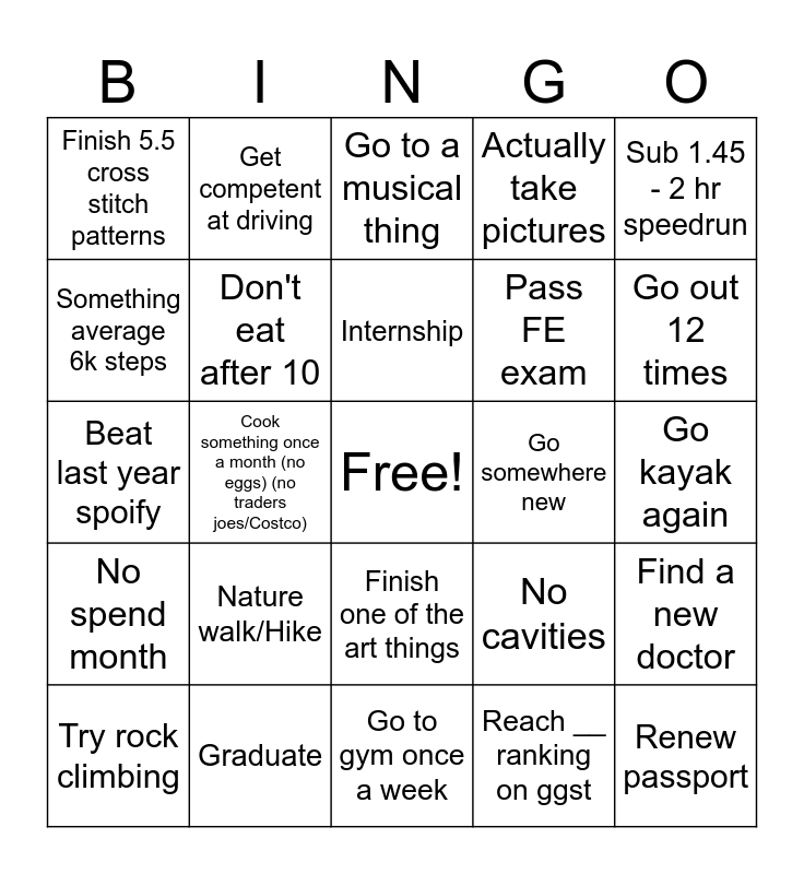 This bingo card has a free space and 24 words: Nature walk/Hike, Graduate, Internship, Try rock climbing, Sub 1.45 - 2 hr speedrun, Finish 5.5 cross stitch patterns, Something average 6k steps, Get competent at driving, Go somewhere new, Finish one of the art things, Pass FE exam, Beat last year spoify, No cavities, Find a new doctor, Don't eat after 10, Reach __ ranking on ggst, Go kayak again, Go to a musical thing, Go out 12 times, Cook something once a month (no eggs) (no traders joes/Costco), Renew passport, No spend month, Actually take pictures and Go to gym once a week.