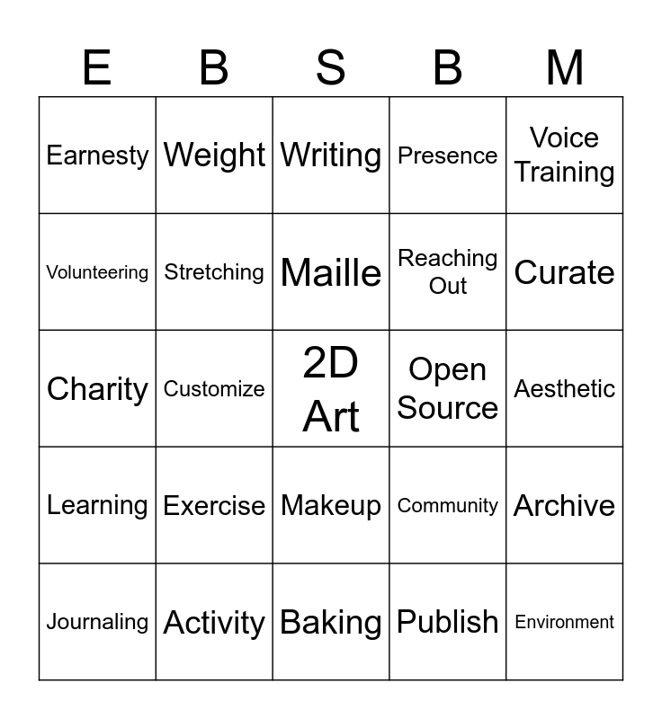 This bingo card has a free space and 24 words: Journaling, Exercise, Maille, Publish, Voice Training, Earnesty, Weight, Writing, Open Source, Aesthetic, Charity, Stretching, Community, Archive, Volunteering, Activity, Baking, Presence, Curate, Learning, Customize, Makeup, Reaching Out and Environment.