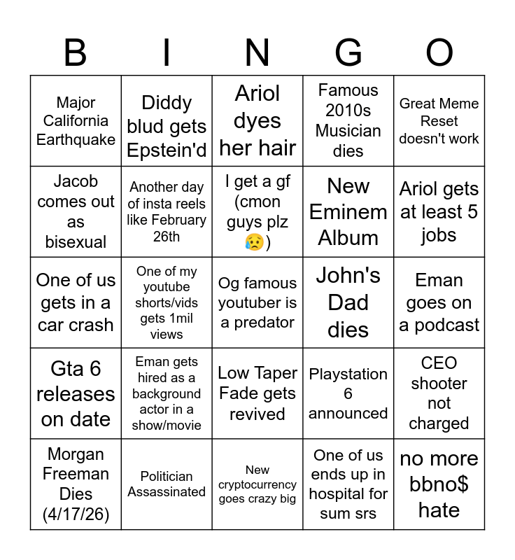 This bingo card has a free space and 24 words: Morgan Freeman Dies (4/17/26), Eman gets hired as a background actor in a show/movie, I get a gf (cmon guys plz 😥), One of us ends up in hospital for sum srs, Great Meme Reset doesn't work, Major California Earthquake, Diddy blud gets Epstein'd, Ariol dyes her hair, John's Dad dies, Eman goes on a podcast, One of us gets in a car crash, Another day of insta reels like February 26th, Playstation 6 announced, CEO shooter not charged, Jacob comes out as bisexual, Politician Assassinated, New cryptocurrency goes crazy big, Famous 2010s Musician dies, Ariol gets at least 5 jobs, Gta 6 releases on date, One of my youtube shorts/vids gets 1mil views, Low Taper Fade gets revived, New Eminem Album and no more bbno$ hate.
