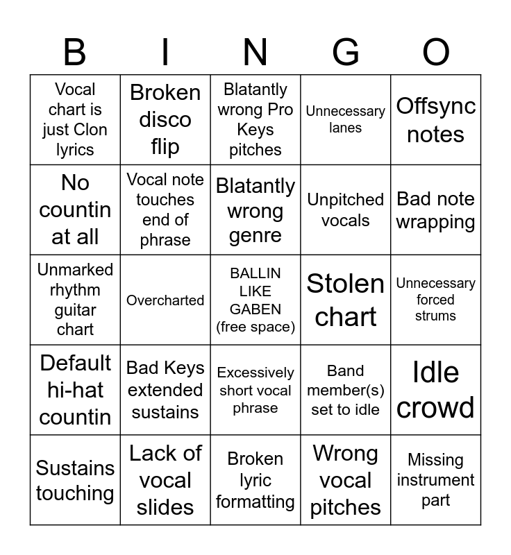 This bingo card has a free space and 25 words: Bad Keys extended sustains, Broken lyric formatting, Blatantly wrong genre, Sustains touching, Offsync notes, Vocal chart is just Clon lyrics, No countin at all, Broken disco flip, Stolen chart, Excessively short vocal phrase, Unpitched vocals, Unmarked rhythm guitar chart, Band member(s) set to idle, Idle crowd, Vocal note touches end of phrase, Excessively long vocal phrase, Unnecessary forced strums, Blatantly wrong Pro Keys pitches, Bad note wrapping, Overcharted, Missing instrument part, Lack of vocal slides, Default hi-hat countin, Unnecessary lanes and Wrong vocal pitches.