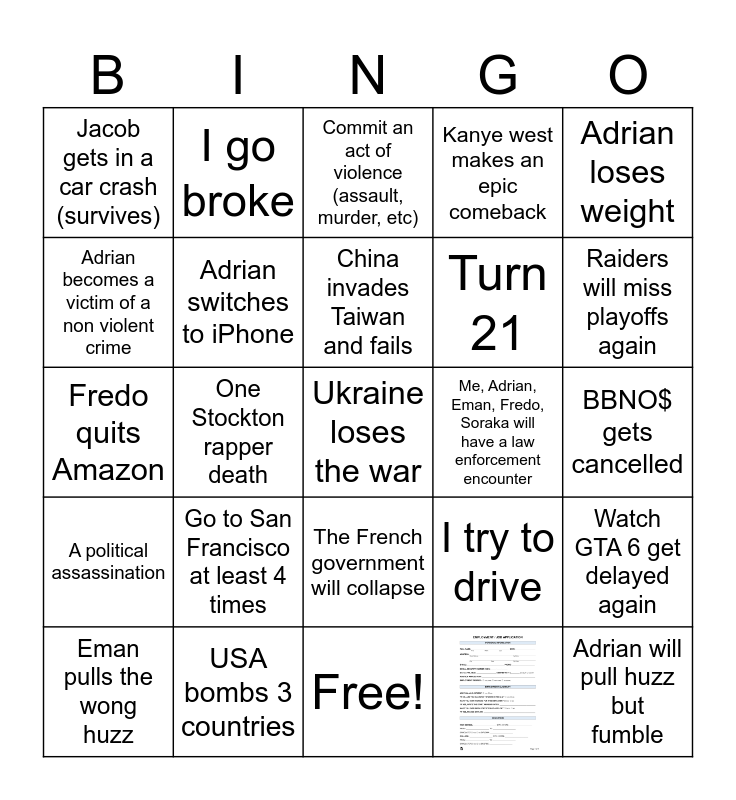 This bingo card has 1 images and 24 words: A political assassination, USA bombs 3 countries, Ukraine loses the war, Adrian loses weight, Jacob gets in a car crash (survives), I go broke, Commit an act of violence (assault, murder, etc), Me, Adrian, Eman, Fredo, Soraka will have a law enforcement encounter, Watch GTA 6 get delayed again, Adrian becomes a victim of a non violent crime, Adrian switches to iPhone, Free!, I try to drive, Raiders will miss playoffs again, Eman pulls the wong huzz, One Stockton rapper death, China invades Taiwan and fails, Turn 21, BBNO$ gets cancelled, Fredo quits Amazon, Go to San Francisco at least 4 times, The French government will collapse, Kanye west makes an epic comeback and Adrian will pull huzz but fumble.