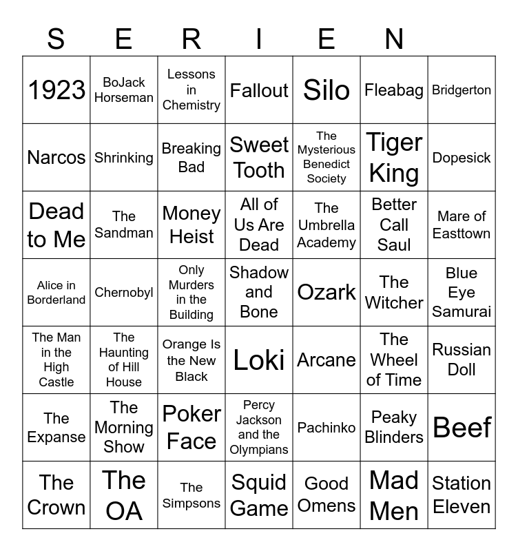 This bingo card has 93 words: Succession, The White Lotus, Chernobyl, The Sopranos, The Wire, True Detective, Euphoria, Mare of Easttown, Station Eleven, Severance, Slow Horses, For All Mankind, The Morning Show, Shrinking, Bad Sisters, Silo, Lessons in Chemistry, Pachinko, Stranger Things, The Crown, Squid Game, Beef, Arcane, Wednesday, Money Heist, Bridgerton, The Witcher, Shadow and Bone, Cobra Kai, Lupin, Alice in Borderland, All of Us Are Dead, The OA, Russian Doll, BoJack Horseman, Orange Is the New Black, Ozark, Mindhunter, Narcos, The Umbrella Academy, Sweet Tooth, The Sandman, Dead to Me, The Haunting of Hill House, Tiger King, Blue Eye Samurai, Shōgun, Andor, The Bear, WandaVision, Reservation Dogs, Only Murders in the Building, Loki, The Mandalorian, Ahsoka, Moon Knight, Percy Jackson and the Olympians, The Simpsons, Bluey, Big Shot, The Mysterious Benedict Society, Fargo, What We Do in the Shadows, The Old Man, Justified, Legion, The Boys, The Marvelous Mrs. Maisel, Fleabag, The Expanse, Reacher, Good Omens, The Wheel of Time, Fallout, The Man in the High Castle, Upload, Breaking Bad, Better Call Saul, Mad Men, The Walking Dead, Interview with the Vampire, The Handmaid’s Tale, Dopesick, 1923, Yellowstone, Star Trek: Strange New Worlds, Poker Face, The Resort, Killing Eve, Peaky Blinders, Derry Girls, The IT Crowd and Black Mirror.