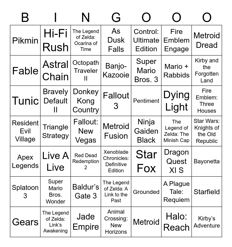 This bingo card has 83 words: Free!, The Legend of Zelda: A Link to the Past, The Legend of Zelda: Ocarina of Time, The Legend of Zelda: Link’s Awakening, The Legend of Zelda: Tears of the Kingdom, Super Mario Odyssey, Super Mario Bros. Wonder, Mario Kart 8 Deluxe, Splatoon 3, Animal Crossing: New Horizons, Pokémon Legends: Arceus, Metroid Prime, Metroid Dread, Kirby and the Forgotten Land, Luigi’s Mansion, Pikmin, Fire Emblem: Three Houses, Fire Emblem Engage, Xenoblade Chronicles 3, Xenoblade Chronicles: Definitive Edition, Bayonetta, Astral Chain, Mario + Rabbids, Paper Mario, Super Mario Bros. 3, The Legend of Zelda, Metroid, Kirby’s Adventure, Super Mario World, Super Metroid, Donkey Kong Country, EarthBound, Star Fox, Banjo-Kazooie, Metroid Fusion, The Legend of Zelda: The Minish Cap, Triangle Strategy, Octopath Traveler, Octopath Traveler II, Bravely Default II, Live A Live, Dragon Quest XI S, No More Heroes 3, Halo: The Master Chief Collection, Gears, Starfield, Hi-Fi Rush, Grounded, Ori, Psychonauts, Pentiment, As Dusk Falls, Tunic, S.T.A.L.K.E.R. 2: Heart of Chornobyl, Cyberpunk 2077, The Witcher 3: Wild Hunt, Red Dead Redemption 2, Assassin’s Creed, Resident Evil Village, Resident Evil, Baldur’s Gate 3, Hogwarts Legacy, Doom Eternal, Control: Ultimate Edition, Metro Exodus: Enhanced Edition, Dying Light, Hitman, Apex Legends, Destiny, No Man’s Sky, It Takes Two, A Plague Tale: Requiem, Red Dead Redemption, Fallout 3, Fallout: New Vegas, The Elder Scrolls IV: Oblivion, Halo: Reach, Fable, Star Wars: Knights of the Old Republic, Ninja Gaiden Black, Jade Empire, Crimson Skies: High Road to Revenge and Psychonauts.