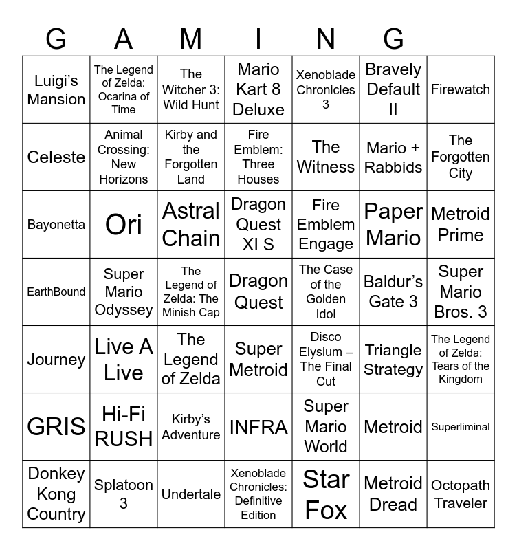 This bingo card has 71 words: The Legend of Zelda: A Link to the Past, The Legend of Zelda: Ocarina of Time, The Legend of Zelda: Link’s Awakening, The Legend of Zelda: Tears of the Kingdom, Super Mario Odyssey, Super Mario Bros. Wonder, Mario Kart 8 Deluxe, Splatoon 3, Animal Crossing: New Horizons, Pokémon Legends: Arceus, Metroid Prime, Metroid Dread, Kirby and the Forgotten Land, Luigi’s Mansion, Pikmin, Fire Emblem: Three Houses, Fire Emblem Engage, Xenoblade Chronicles 3, Xenoblade Chronicles: Definitive Edition, Bayonetta, Astral Chain, Mario + Rabbids, Paper Mario, Super Mario Bros. 3, The Legend of Zelda, Metroid, Kirby’s Adventure, Super Mario World, Super Metroid, Donkey Kong Country, EarthBound, Star Fox, Banjo-Kazooie, Metroid Fusion, The Legend of Zelda: The Minish Cap, Triangle Strategy, Octopath Traveler, Octopath Traveler II, Bravely Default II, Live A Live, Dragon Quest XI S, Dragon Quest, Ori, What Remains of Edith Finch, A Short Hike, Journey, Superliminal, Firewatch, INSIDE, GRIS, COCOON, Titanfall, The Forgotten City, The Case of the Golden Idol, Undertale, Return of the Obra Dinn, Celeste, Portal 2, Hi-Fi RUSH, The Rise of the Golden Idol, Pentiment, Outer Wilds, The Witness, The Longest Journey, INFRA, Disco Elysium – The Final Cut, The Witcher 3: Wild Hunt, Assassin’s Creed, Resident Evil, Baldur’s Gate 3 and Control: Ultimate Edition.